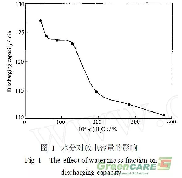 實驗電池的水含量和首次300 mA放電容量的關系如圖1所示。由圖1可知,在電池中水分小于01015%時,電池首次放電容量符合國標且變化較小(300 mA 放電( 125 ±2 ) min ) ; 在電池水分在01015%~0104%范圍內時,電池首次放電容量隨電池中水分的增加而減小。在鋰源恒定的條件下,電池首次放電容量的變化受如下2個主要因素制約: