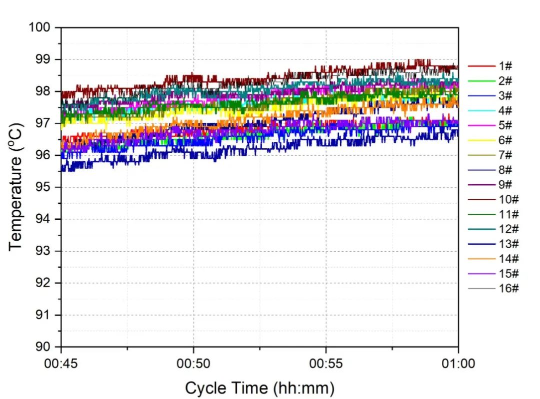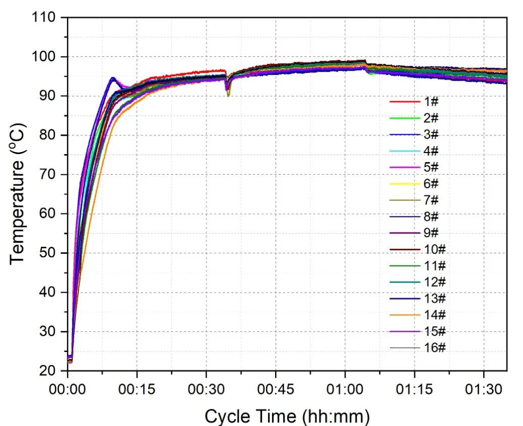 圖二:時代高科隧道爐整個干燥過程溫度記錄(16點空間分布測溫)