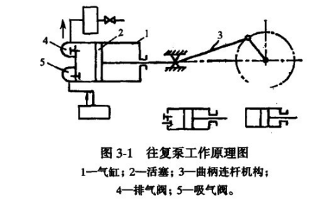 往復真空泵的工作原理如圖所示。主要部件是氣缸1及在其中做往復直線運動的活塞2。活塞的驅(qū)動是用曲柄連桿3來完成的。除上述主要部件外還有排氣閥4和吸氣閥5.運轉(zhuǎn)時,在電動機的驅(qū)動下,通過曲柄連桿機構(gòu)的作用,使氣缸內(nèi)的活塞做往復運動。當活塞在氣缸內(nèi)從左端向右端運動時,由于氣缸的左腔體積不斷增大,氣缸內(nèi)氣體的密度減小,而形成抽氣過程,此時容器中的氣體經(jīng)過吸氣閥5進人泵體左腔。當活塞達到最右位置時,氣缸內(nèi)就完全充滿了氣體。接著活塞從右端向左端運動,此時吸氣閥5關閉。氣缸內(nèi)的氣體隨著活塞從右向左運動而逐漸被壓縮,當氣缸內(nèi)氣體的壓強達到或稍大于大氣壓時,排氣閥4被打開,將氣體排到大氣中,完成一個工作循環(huán)。當活塞再自左向右運動時,又吸進一部分氣體,重復前一循環(huán),如此反復下去.直到被抽容器內(nèi)達到某一穩(wěn)定的平衡壓力為止。