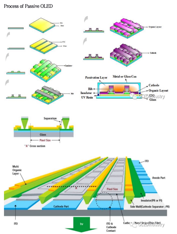 為了實現無源矩陣OLED的高分辨率和彩色化,更好地解決陰極模板分辨率低和器件成品率低等問題,人們在研究中引入了陰極隔離柱結構。即在器件制備中不使用金屬模板,而是在蒸鍍有機薄膜和金屬陰極之前,在基板上制作絕緣的間壁,最終實現將器件的不同像素隔開,實現像素陣列。