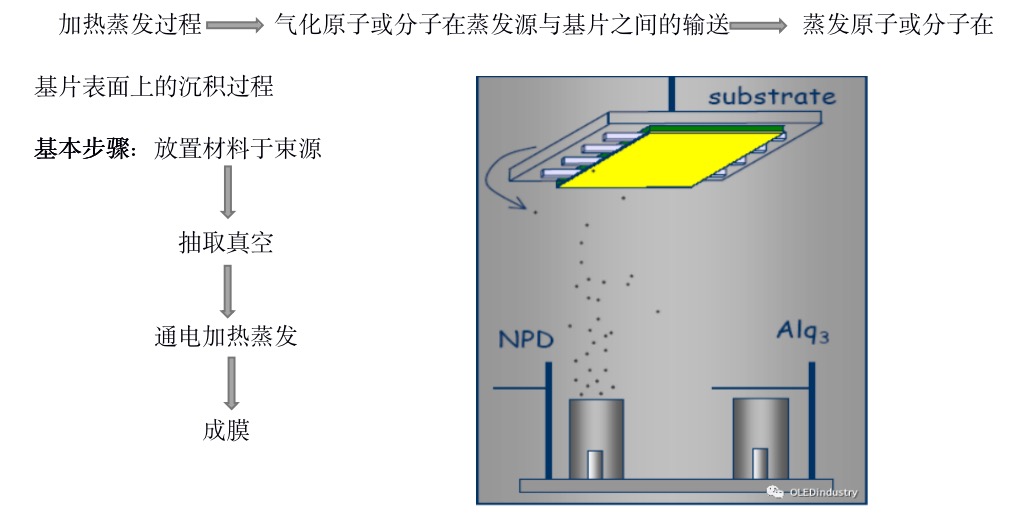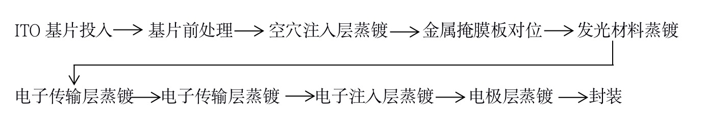 小分子OLED器件通常采用真空蒸鍍法制備有機薄膜和金屬電極,其具體操作過程是在真空中加熱蒸發容器中待形成薄膜的原材料,使其原子或分子從表面氣化逸出,形成蒸汽流,入射到固體襯底或基片的表面形成固態薄膜。