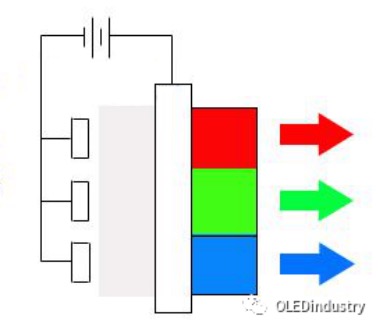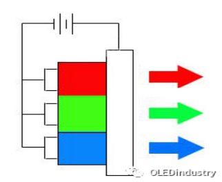 這是最常使用的技術,就是將三種發光層排列在一起,加入不同的偏壓產生全彩的效果,此技術重點在于發光材料光色純度與效率的掌握。以小分子有機發光二極管技術而言,所面臨的重大問題就是紅色材料的純度、效率與壽命,而大分子有機發光二極管方面,則是在于紅、綠、藍三原色定位等問題