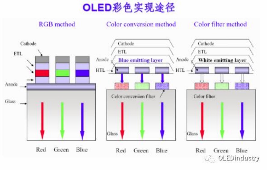 小分子OLED全彩色顯示技術方面,實現彩色化的方法有光色轉換法、彩色濾光薄膜法、獨立發光材料法等。