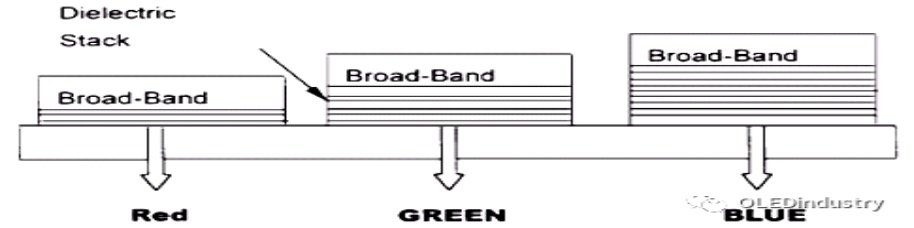 首先制備發白光或近于白光的器件,然后通過微腔共振結構的調諧,得到不同波長的單色光,然后再獲得彩色顯示。