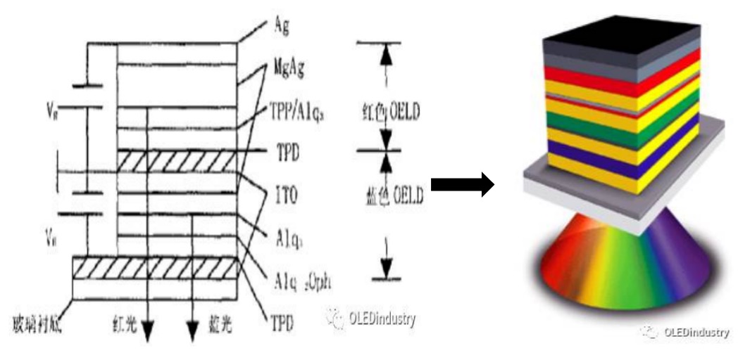 此法是將三種發光層疊在一起,使紅、綠、藍混色產生白光,或是互補色產生白光。此全彩化技術最大的優點是可以直接應用液晶顯示器現有的彩色濾光片技術,但是元件發光時必須多經過一層彩色濾光片,導致亮度衰減,因此在透光率與成本上必須再深入研究。