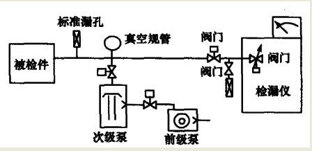 對于體積小、放氣速率和漏氣速率都小的被檢件可直接與檢漏儀的外接法蘭連接進行檢漏,無需輔助真空系統。對于漏氣速率和放氣速率較大或者體積較大的被檢件,若直接與檢漏儀相連接時,檢漏儀的真空度可能抽不上去,使檢漏儀無法工作。要在此種情況下進行檢漏,只有調節節流閥,使之稍稍開啟,但這又會使反應時間加長。此外,被檢件初次抽真空時,其中的水氣、油蒸氣等都可能污染檢漏儀,因此也需要有輔助真空系統。輔助系統由前級泵、次級泵、閥門、真空規及標準漏孔等組成,如圖1所示。次級泵可用擴散泵或羅茨泵(是否需要次級泵視具體情況而定),前級泵最好用氣鎮式機械泵。