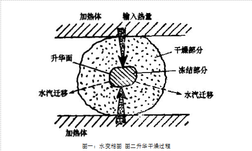 圖二為物品水分升華過程示意圖。其干燥過程是由周圍逐漸向內部干燥,干燥層逐漸增厚,可看成多孔結構。升華熱由加熱體通過干燥層不斷地傳給凍結部分,在干操與凍結交界的升華面上,水分子得到加熱后,將脫離升華面,沿著毛細孔跑到周圍環境中。而環境中的氣壓必須低于升華面上的飽和蒸氣壓Po,只有這樣才能造成一個水分子向外遷移的動力。這憊味著升華千操必須在真空環境中進行。另外物料是處于凍結狀態,需維持溫度低于三相點;在真空環境下,此溫度易于保持。
