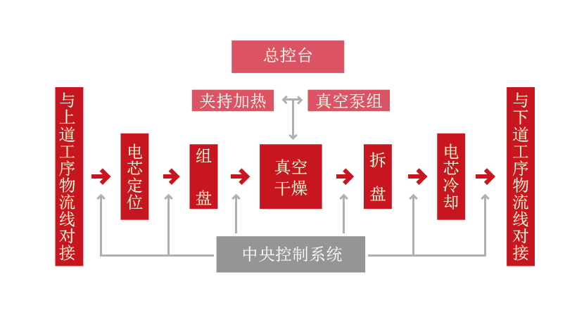 設備用于電芯等物料的物流調度及干燥功能,具備工藝流程自動控制,歷史數據查詢導出,關鍵參數實時顯示,問題報警及原因追溯,安全保護,主要功能包括:電芯掃碼、上料及緩存、物料烘烤、水含量測試、電芯冷卻、溫度檢測及下料。
